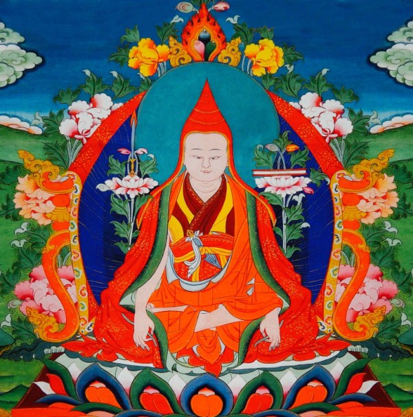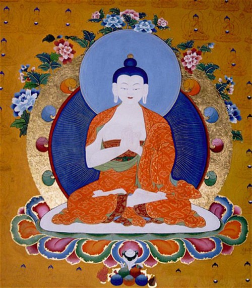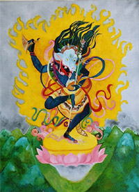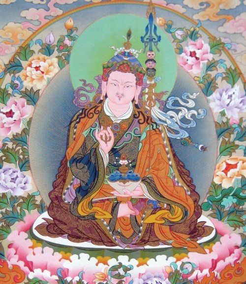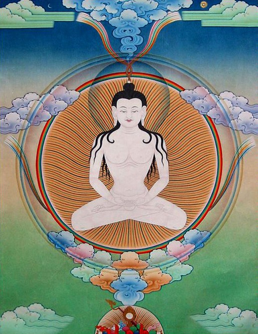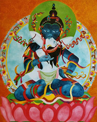 sa nature est la manifestation incessante des cinq lumières ; et les apparences de son énergie compatissante sont tel un ciel sans nuages.