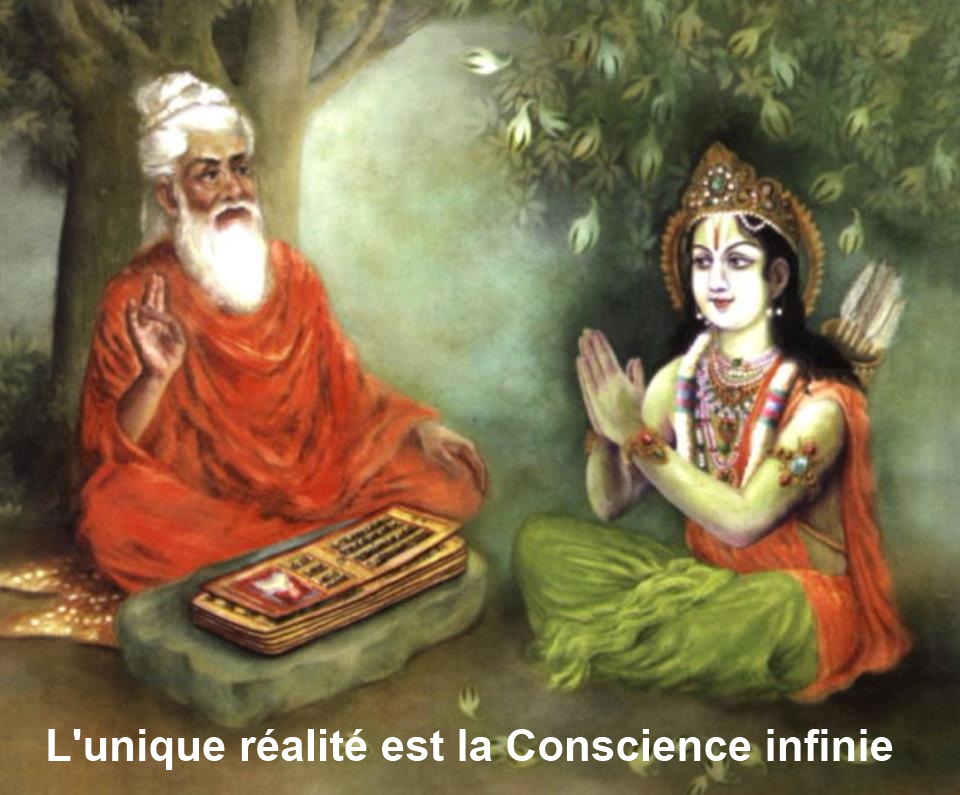 Il n'y a rien d'autre, ô Rama. Tu es l'existence même de cet absolu Brahman. Libère-toi donc de toutes ces notions de dualité et mène une vie active. Qu'as-tu à gagner à accomplir maintes et maintes fois toutes sortes d'actions ? Et que gagneras-tu à souhaiter être inactif ? Ou à suivre les saintes écritures à la lettre ? Ô Rama, repose en paix et en pureté tel l'océan que n'agite aucun vent. Ce Soi, dont toute chose est imprégnée, ne se trouve pas en voyageant aux quatre coins de la terre. Ne laisse pas ton mental vagabonder parmi les objets du monde. Tu es toi-même le Soi suprême, la Conscience infinie. Tu n'es rien d'autre ! Ô Rama, le sentiment d'être l'auteur de ses actes qui fait naître à la fois bonheur et malheur, est pure fiction aux yeux du sage ; mais, pour l'ignorant, il s'agit d'une réalité. Quelle est l'origine de cette notion ? Cette notion survient quand le mental, aiguillonné par la prédisposition, tente d'obtenir quelque chose ; l'homme s'attribue alors l'action qui en résulte. Quand la même action porte les fruits escomptés, se présente la notion « J'y prends plaisir ». A vrai dire, les deux notions sont les deux faces de la même notion. Qu'on soit engagé ou non dans l'action, qu'on soit au ciel ou en enfer, peu importe le conditionnement psychologique, c'est le mental qui en fait l'expérience. Ce qui explique qu'à l'ignorant et à l'homme conditionné se présente la notion « Je fais cela », qu'il fasse quelque chose ou qu'il ne fasse rien ; mais pareille notion ne se présente pas chez l'éveillé ou l'être dégagé de tout conditionnement. Quand la vérité relative à ce phénomène est connue, le conditionnement est affaibli et désormais le sage, même pendant qu'il agit en ce monde, se désintéresse des fruits de ces actions. Il laisse les actions se produire dans sa vie sans s'y attacher et, quels que soient les résultats de ces actions, il ne les juge pas différentes de son propre Soi. Ce n'est pas l'attitude d'un homme plongé dans les états mentaux.