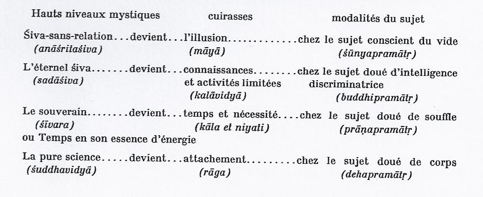 Un tableau tiré du Tantraloka (VI, 42-44) montre les relations entre les purs niveaux mystiques, les cuirasses qui emprisonnent
